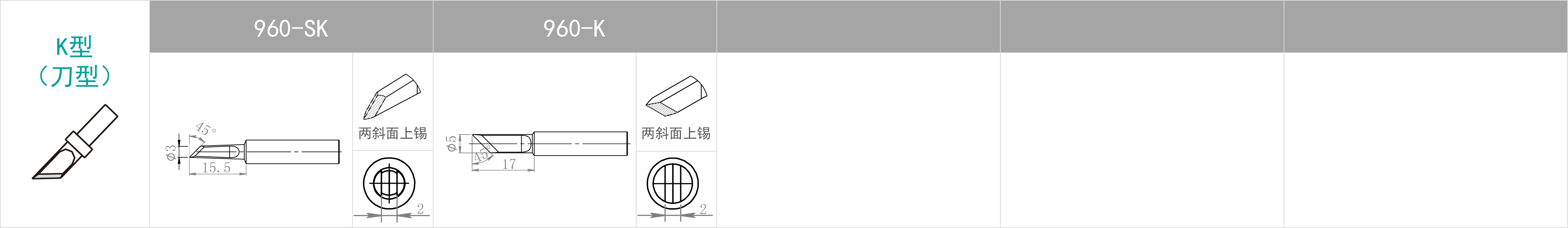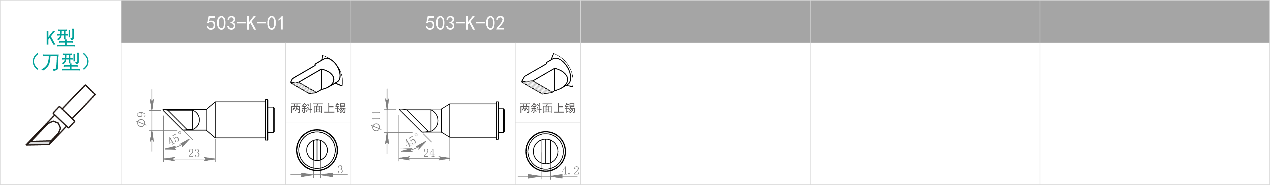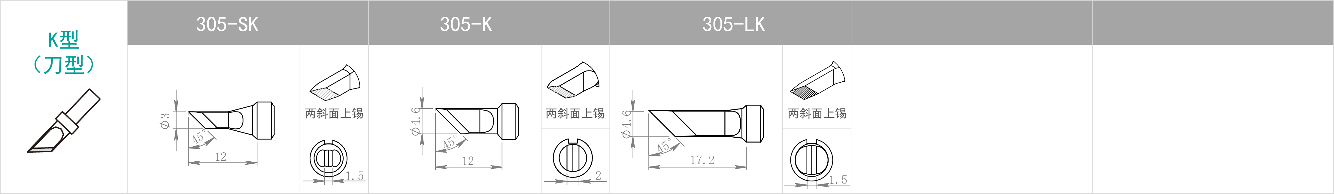 | 特點(diǎn) | 焊咀尖端尖細(xì) | B型焊咀無(wú)方向性, 整個(gè)焊咀前端均可進(jìn)行焊接 | 用批咀部分進(jìn)行焊接 | 用焊咀前端斜面部分進(jìn)行焊接。 適合需要多錫量之焊接 | 使用刀形部分焊接, 豎立式或拉焊式焊接均可。 屬于多用途焊咀 |